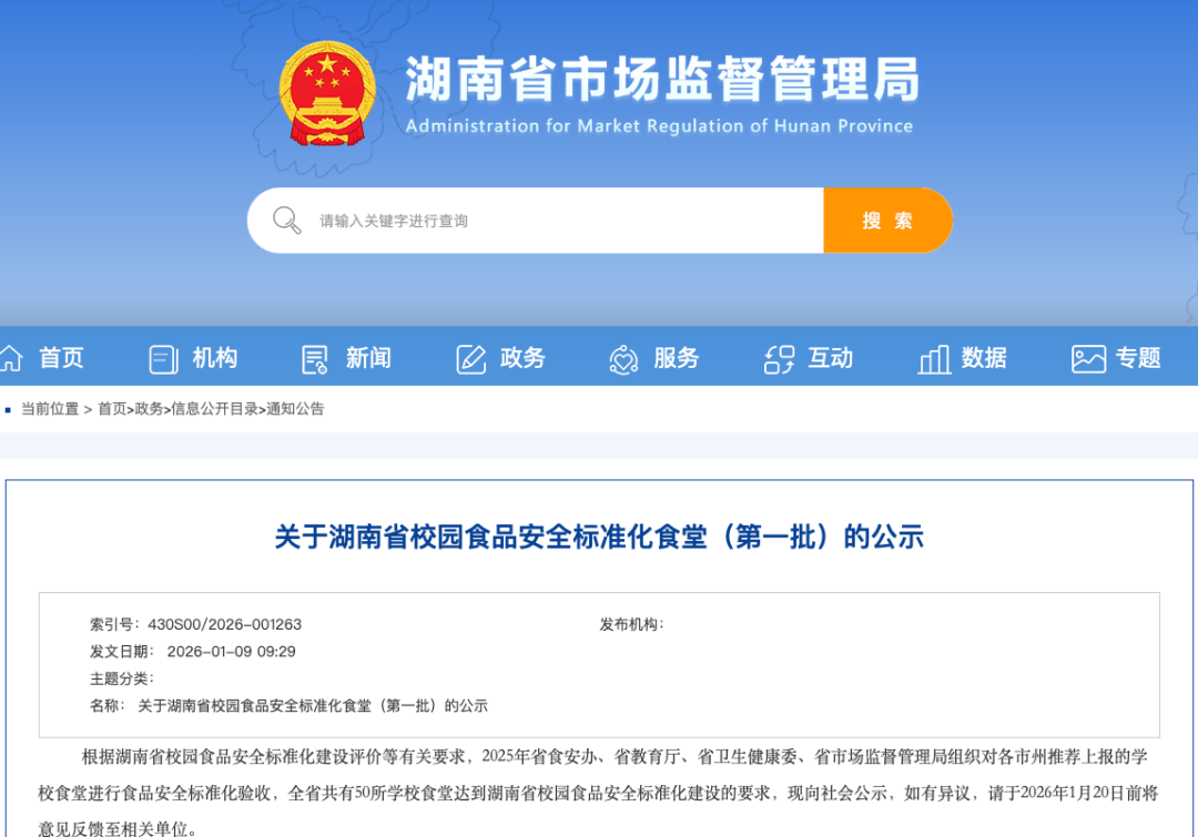 1月9日,省食安办、省教育厅、省卫生健康委、省市场监视办理局结合发布《关于湖南省校园食物平安尺度化食堂(第一批)的公示》。按照湖南省校园食物平安尺度化扶植评价等相关要求,2025年上述四部分组织对各市州保举的学校食堂进行食物平安尺度化验收,经严酷评审,全省共有50所学校食堂达到湖南省校园食物平安尺度化扶植尺度。